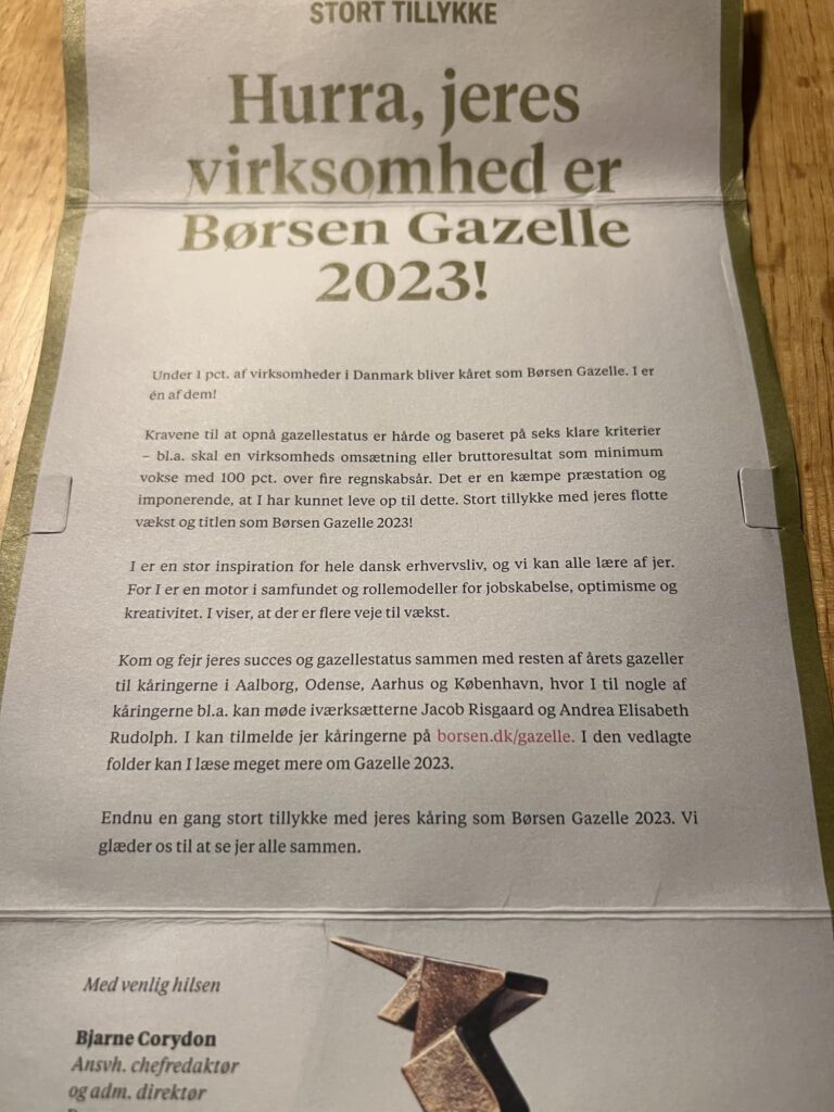 En stor milepæl er nået. Vi har lige modtaget et meget fint brev i vores postkasse om, at Tømrermester Martin Jespersen ApS modtager Børsen Gazelle-pris 2023.